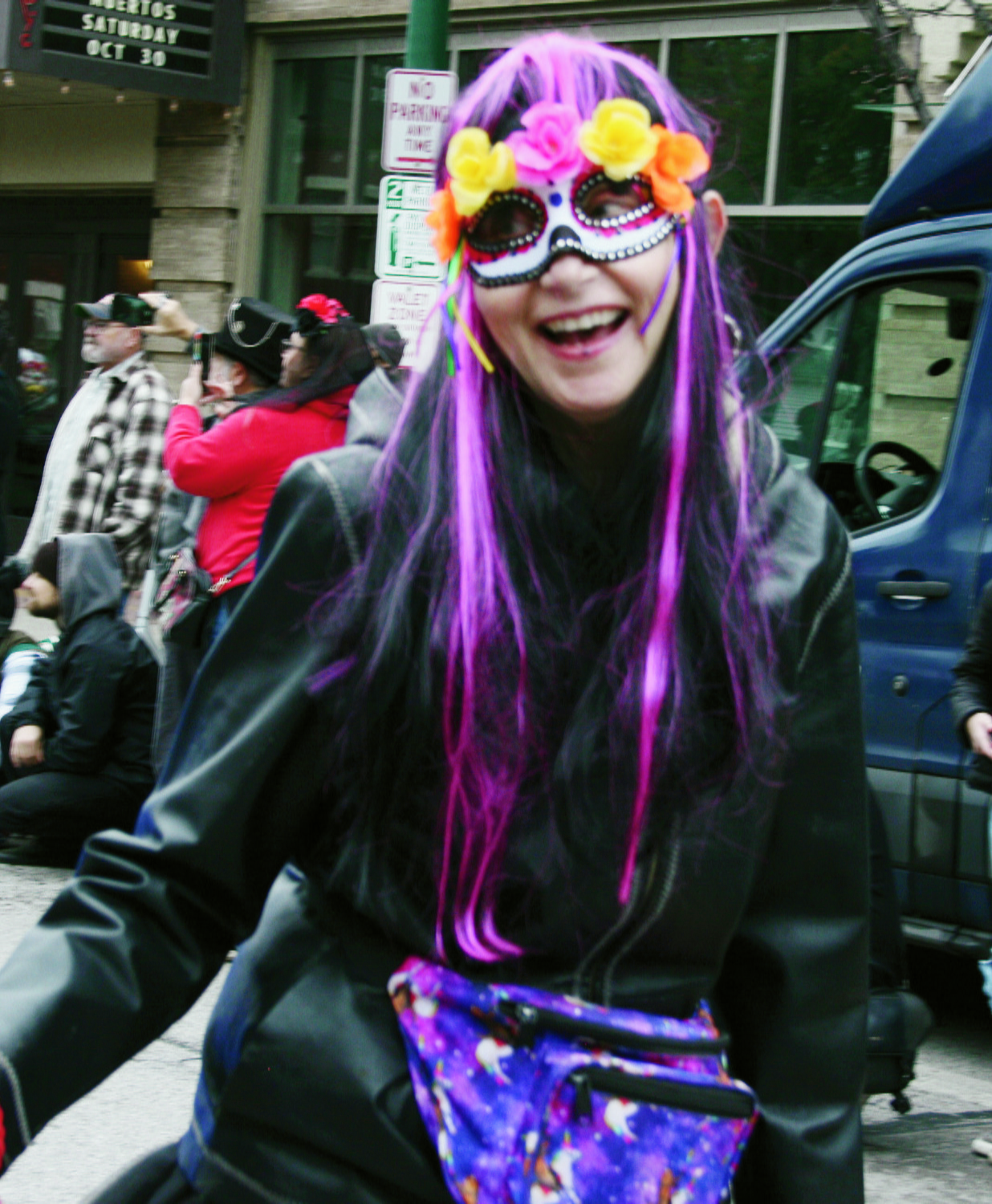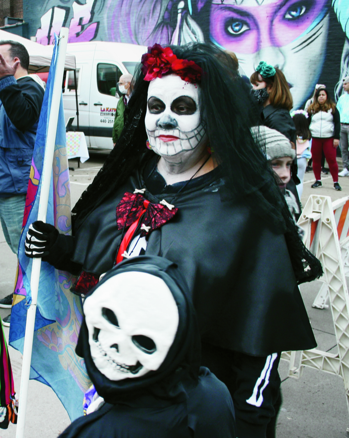 Saturday, October 30, 2021; Día de Muertos 2021 hosted by Cleveland Public Theatre/ Theatro Público de Cleveland & Día de Muertos Ohio under the direction of Artistic Director Héctor Castellanos Lara; Cleveland Public Theatre – Church, Parish Hall and surrounding area, 6205 Detroit Avenue: Woman with a smiling skeleton face in the parking area outside of the Parish Hall with the mural on the side of TRD Leather in the background.