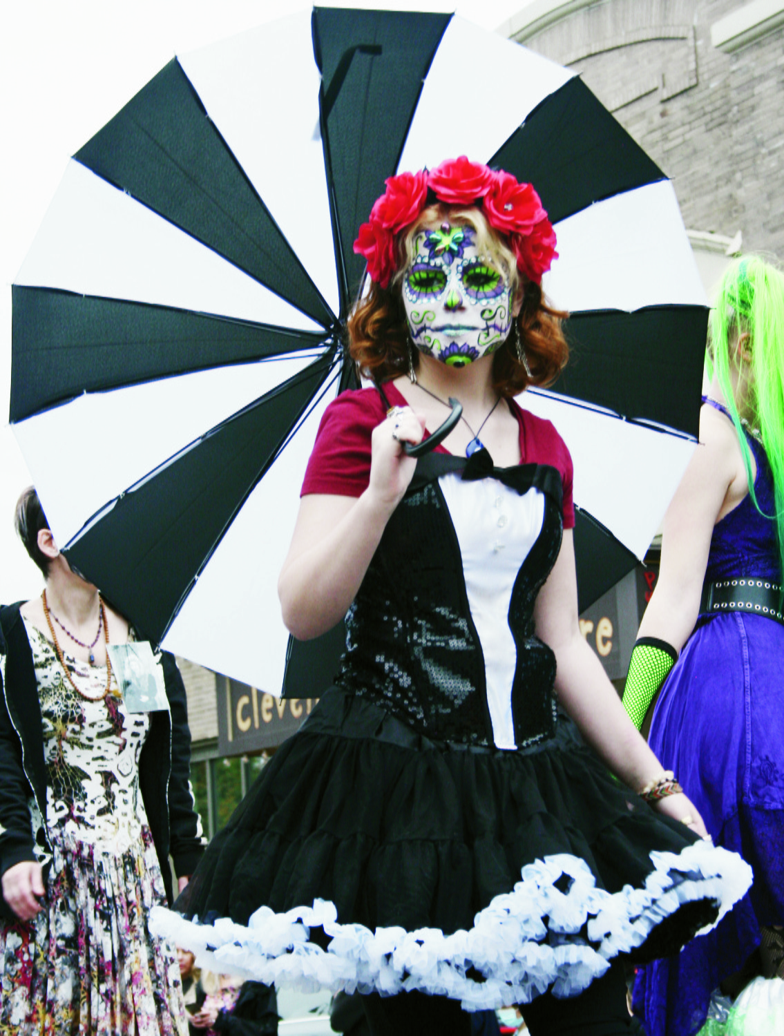 Saturday, October 30, 2021; Día de Muertos 2021 hosted by Cleveland Public Theatre/ Theatro Público de Cleveland & Día de Muertos Ohio under the direction of Artistic Director Héctor Castellanos Lara; Cleveland Public Theatre – Church, Parish Hall and surrounding area, 6205 Detroit Avenue: A woman carries an umbrella, ready for possible rain during the Skulls and Skeletons Procession.