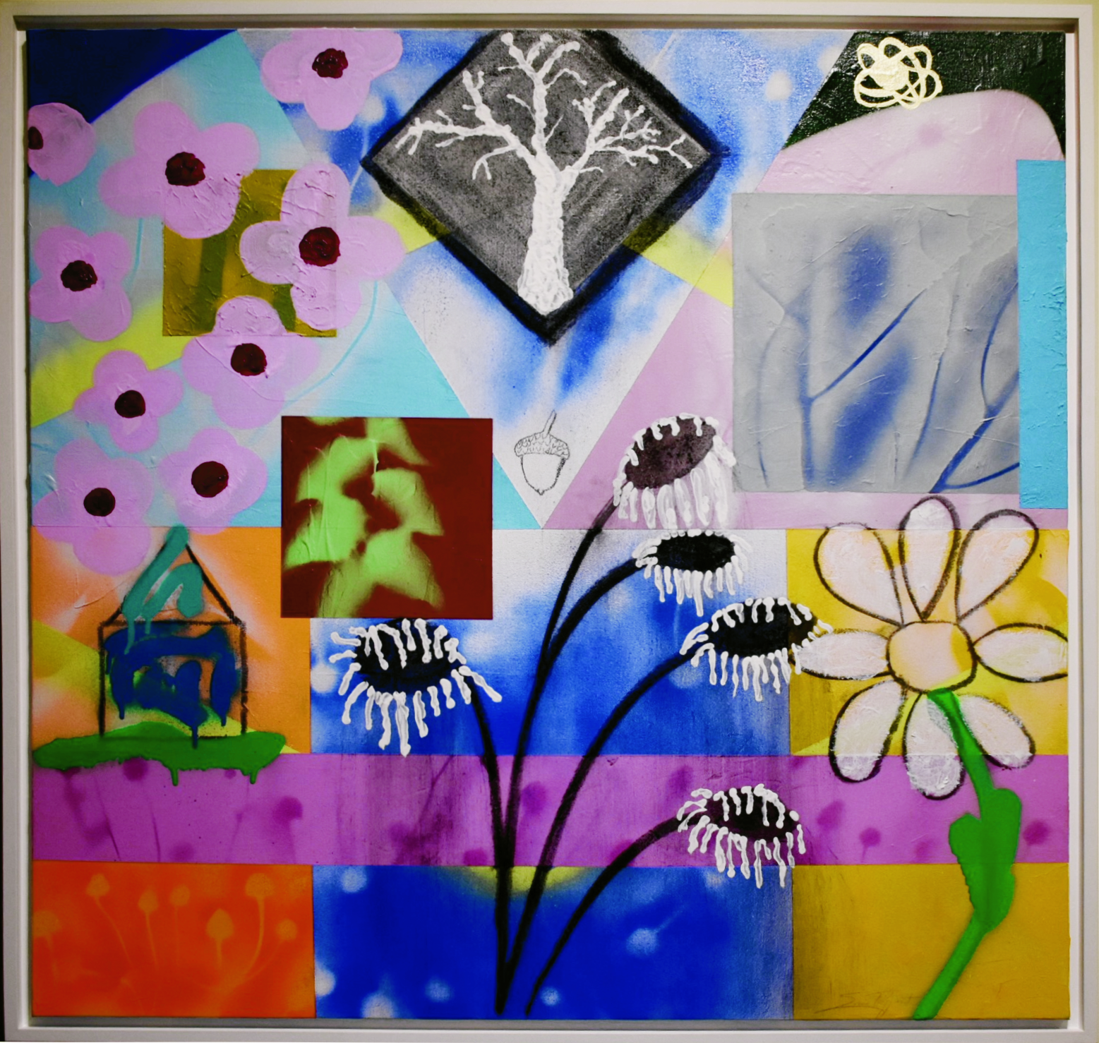 Friday, February 18, 2022; Third Friday at W. 78th Street Studios, 1300 W. 78th Street: Eric Rippert Studio displayed this artwork titled I Found That Essence Rare. The work was made using acrylic, house paint, spray paint, charcoal, graphite, and crayon on canvas.