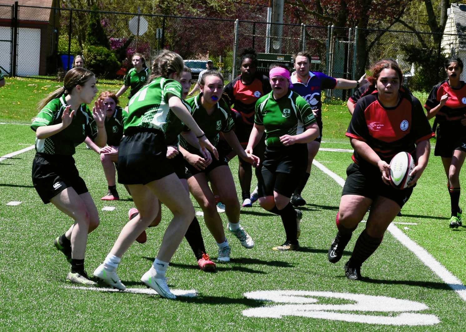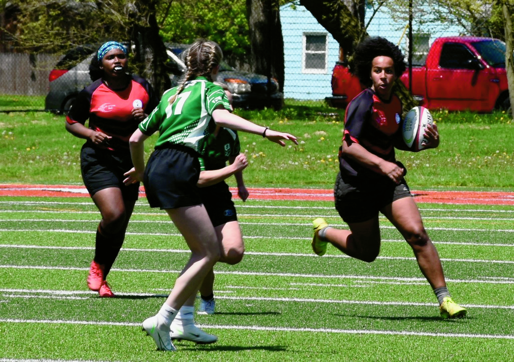 Sunday, May 8, 2022; Girls Rugby Game between John Marshall High School and Medina High School, John Marshall High School field, 3952 W. 140th Street: John Marshall’s Girls’ Rugby team, the Cleveland Metropolitan School District’s first girls’ rugby team, is fully engaged in this game against Medina High School.