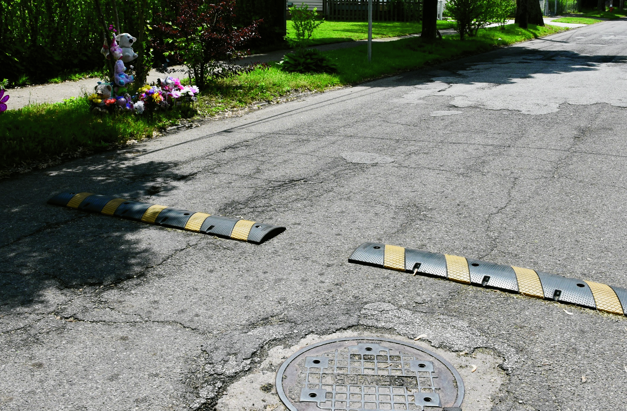 Thursday, May 19, 2022; W. 50th just South of Clark Avenue: Residents placed these speed bumps near the memorial to Apulina Asamani to slow traffic on their street.