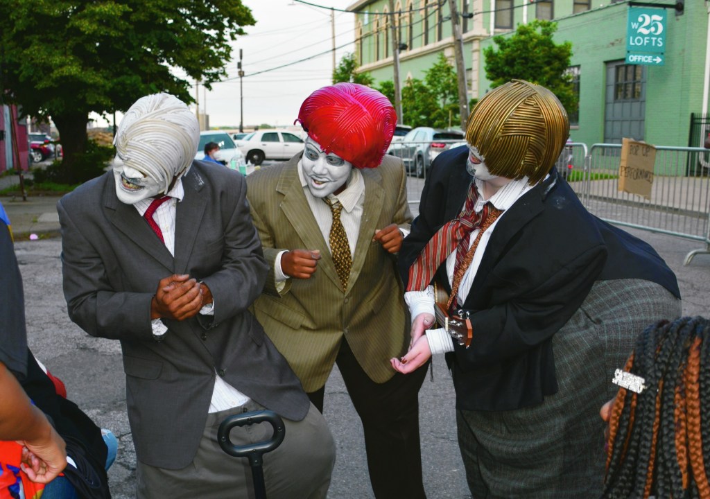 Saturday, May 28th, 2022; Cleveland Public Theatre’s Station Hope 2022; on grounds of St. John’s Episcopal Church, an authenticated stop on the Underground Railroad, at 2600 Church Avenue: Three members of the Ohio City Theatre Project interact with the crowd. The group staged a popup performance titled Central Concern, written and directed by Pandora Robertson. (A satirical look at the history of the American real estate profession and how it championed property values at the expense of civil rights.)