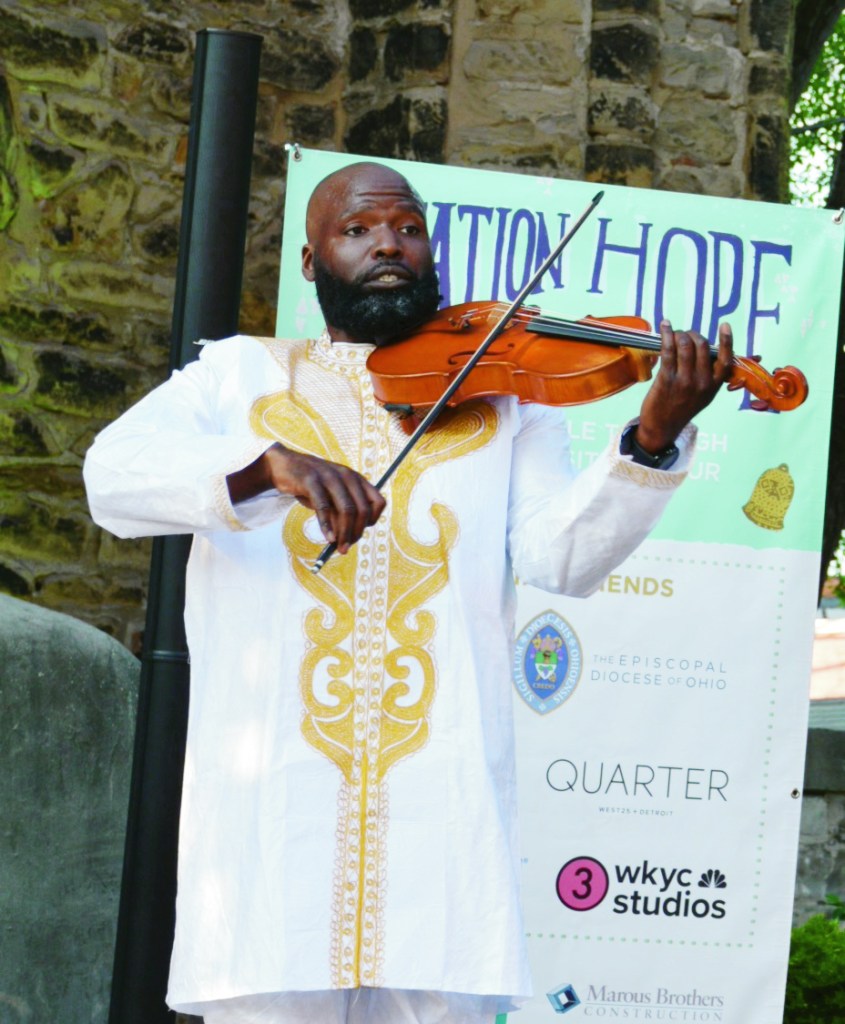 Saturday, May 28th, 2022; Cleveland Public Theatre’s Station Hope 2022; on grounds of St. John’s Episcopal Church, an authenticated stop on the Underground Railroad, at 2600 Church Avenue: Darnell Weaver, a member of the Mojuba Dance Collective, plays the viola during the performance of The Clotilda’s Hour: A Resurrection!