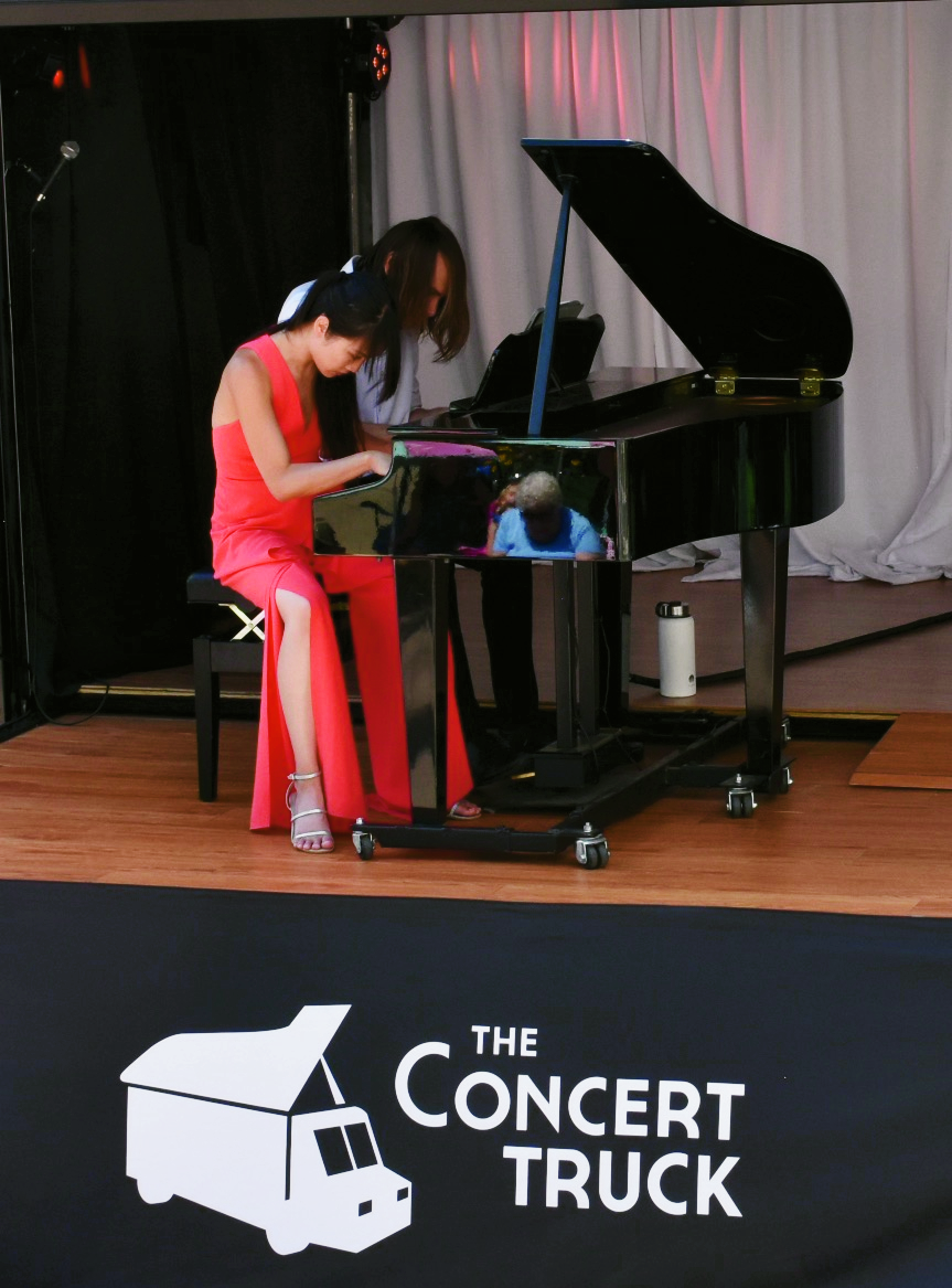Saturday, August 6, 2022; Piano Days CLE event at Cleveland Public Library’s Carnegie Branch, Fulton Road at Bridge Avenue: Pianists Nick Luby and Susan Zhang provide a free piano concert to area residents from The Concert Truck. The Concert Truck is a 16-foot box truck converted to a mobile concert hall complete with lights, sound system and a piano.