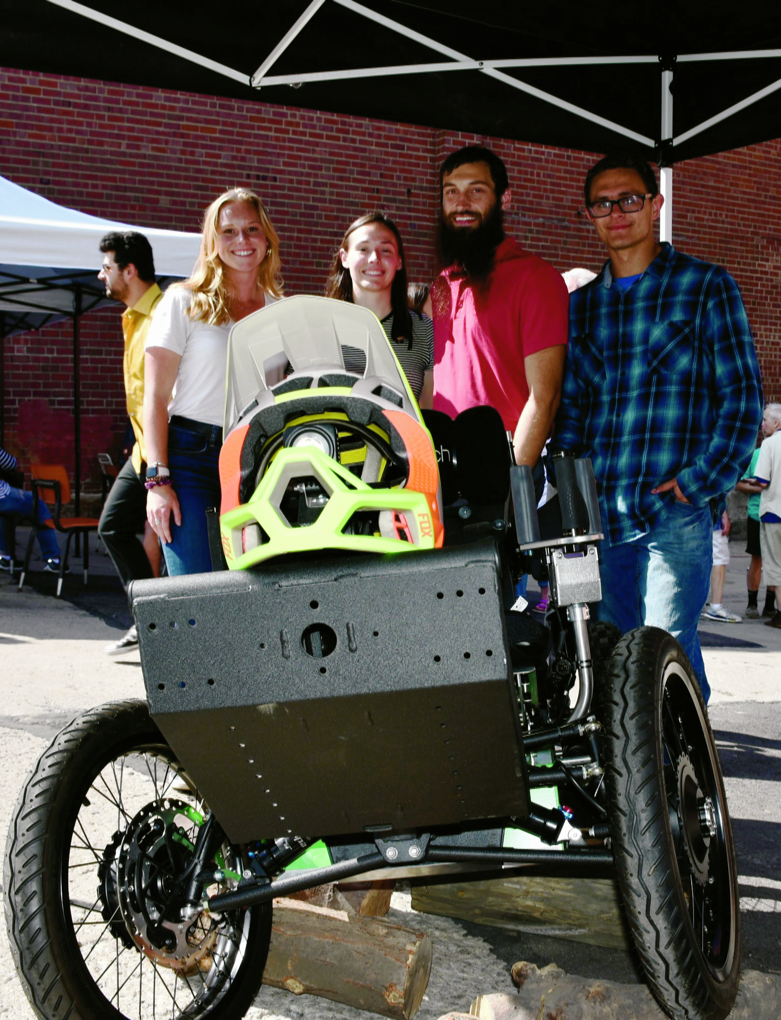 Friday, September 9, 2022; The Big Reveal, Ray’s Indoor Bike Park, 9801 Walford: This crew from Cleveland State University made use of the Center for Human Machine Systems Lab at CSU, tapped into the Manufacturing Advocacy and Growth Network (MAGNET) for fabricated parts, and the Spinal Cord Injury Volunteer Corps to equip Ray Petro’s electric four-wheel mountain bike with accessible power steering mechanism. Ray Petro, owner of Ray’s Indoor Bike Park, was injured in a mountain bike accident at a Cleveland Metroparks location in Strongsville, which led to his need for a four-wheel mountain bike with power steering. The CSU team: (L-R) Doctoral Student Skye Carlson (President of the Spinal Cord Injury Volunteer Corps), Kyra Stovicek (B.S. Mechanical Engineering 2022), Steven Wilson (B.S. Mechanical Engineering 2022), and Tyler Tokarcik, Equipment Mechanic Apprentice.