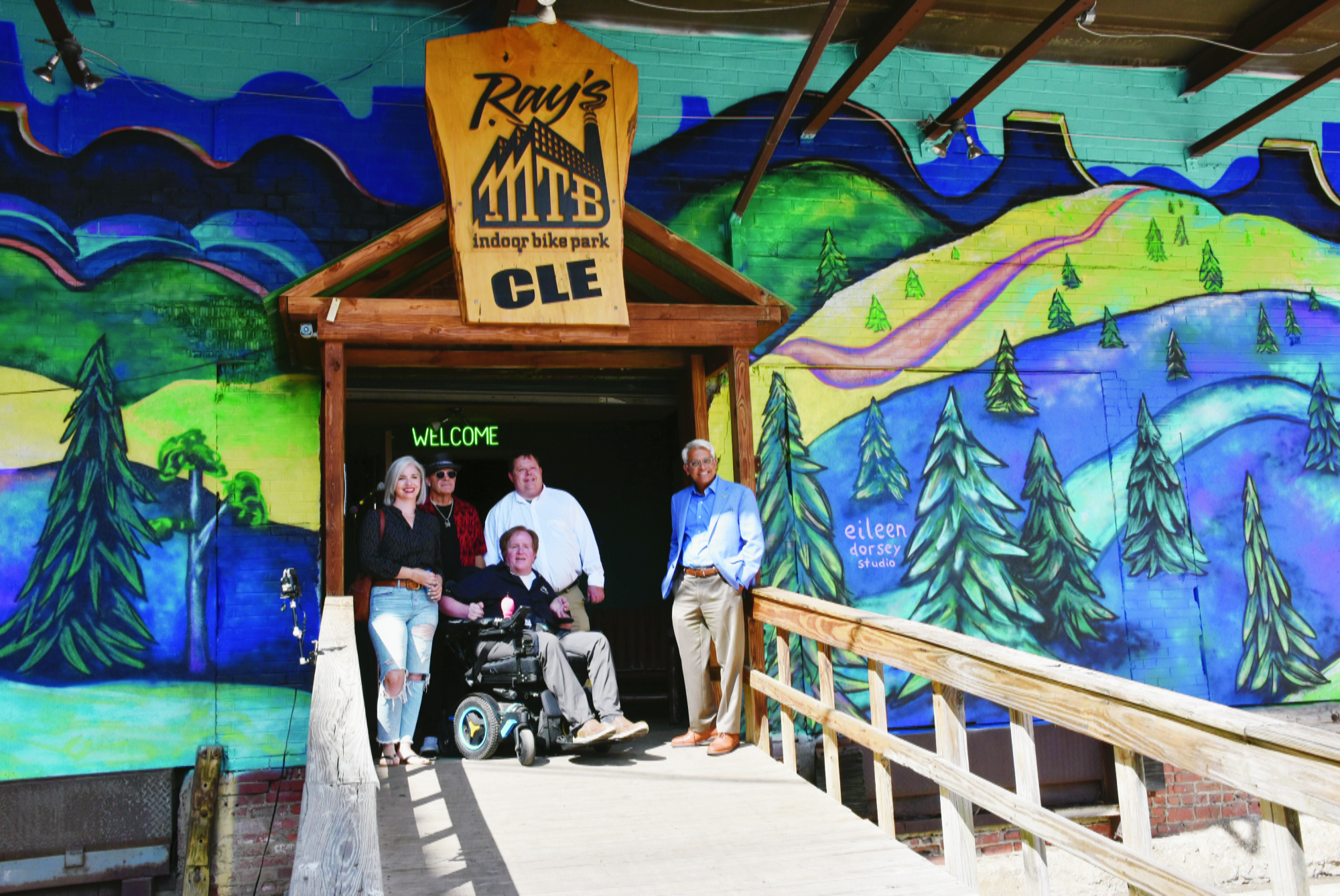 Artist Eileen Dorsey joined with Ray Petro, owner of Ray’s Indoor Bike Park, to design a mural for the entrance to the bike park. A scene of an outdoor mountain bike path now greets guests to Ray’s Indoor Bike Park. The mural was unveiled at “The Big Reveal” celebration. Dorsey says it took her a week and a half to paint the mural. Dorsey has a studio at W. 78th Street Studios. In the doorway to the bike park during the unveiling of the mural are: (L-R) Artist Eileen Dorsey, Master of Ceremonies and Vanity Crash drummer Thomas Mulready, Ray’s Indoor Bike Park owner Ray Petro, Ward 11 City Council Representative Brian Mooney, and Cleveland State University (CSU) Dean of the College of Graduate Studies Dr. Nigamanth Sridhar who is representing the CSU team that worked on Ray Petro’s electric mountain bike.
