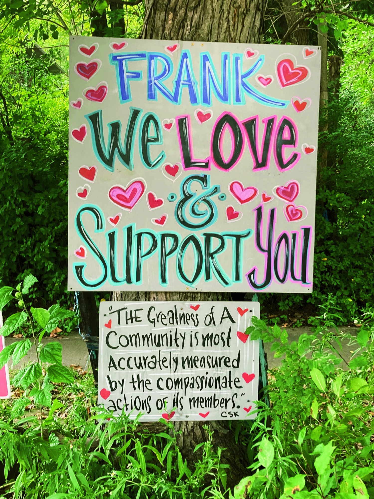 Thursday, September 29, 2022: Frank Giglio’s yard on W. 14th Street, Friends of Frank Giglio send some messages to him and to the community with their artwork. The messages read: “Frank We Love & Support You.” and “The greatness of a community is most accurately measured by the compassionate actions of its members.”