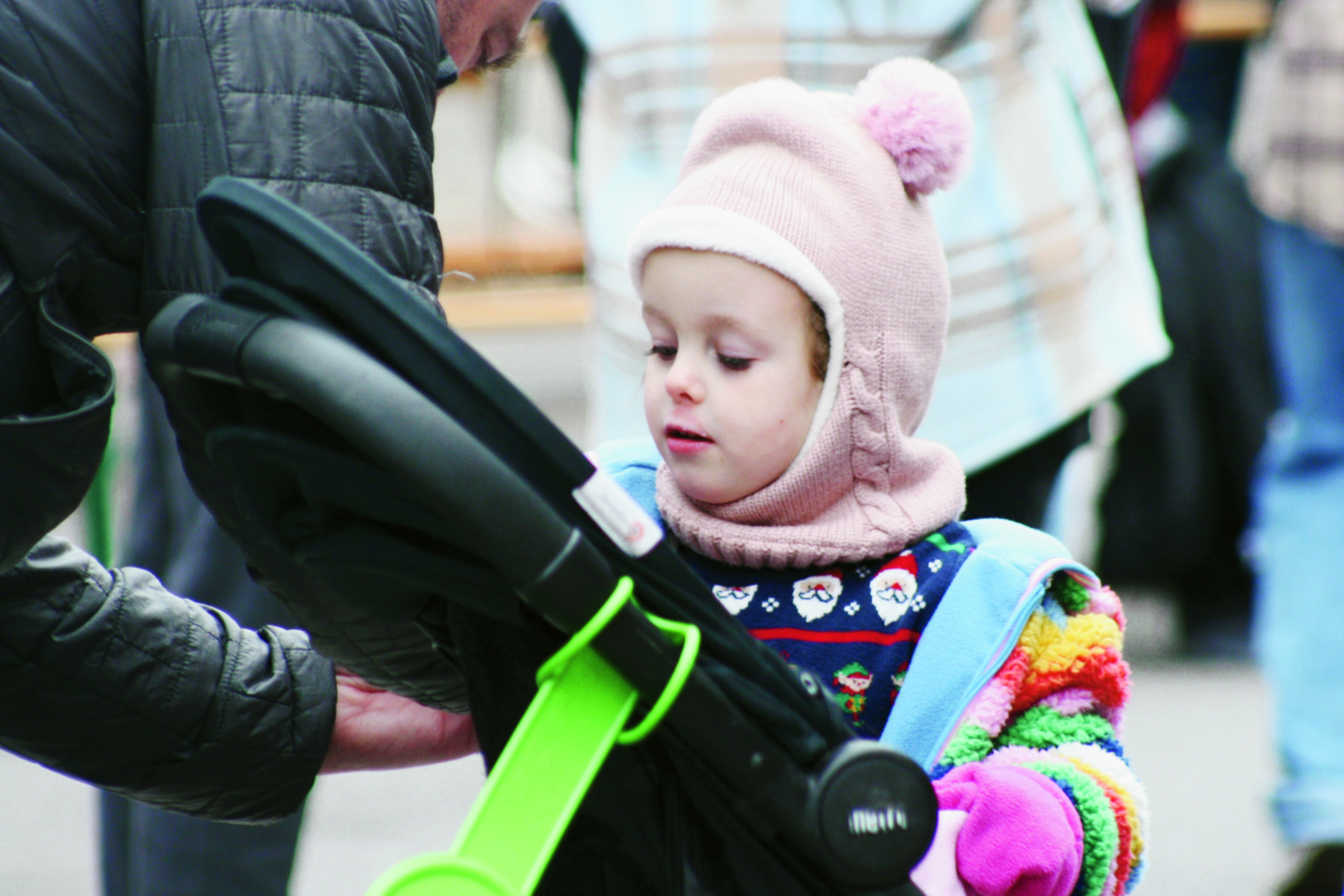 Saturday, December 10, 2022; Snow Day in Detroit Shoreway, W. 65th and Detroit Avenue: A child, dressed for Snow Day, expresses thoughtful interest.