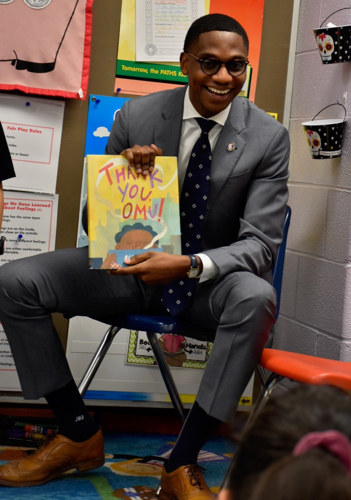 Mayor Bibb then showed the students the book he brought to read to them, Thank You OMU by Oge More. Mayor Justin Bibb began to read the story about OMU cooking a big pot of red stew. The story tells of the many people drawn to OMU’s house by the smell of the pot of cooking stew. OMU gives every one of the visitors a bowl of red stew to eat. By the time OMU was ready to eat – all the stew was gone. But then all those who received a share of OMU’s stew began to show up at the door bringing food. In the end, they all came together to share a feast at OMU’s home.