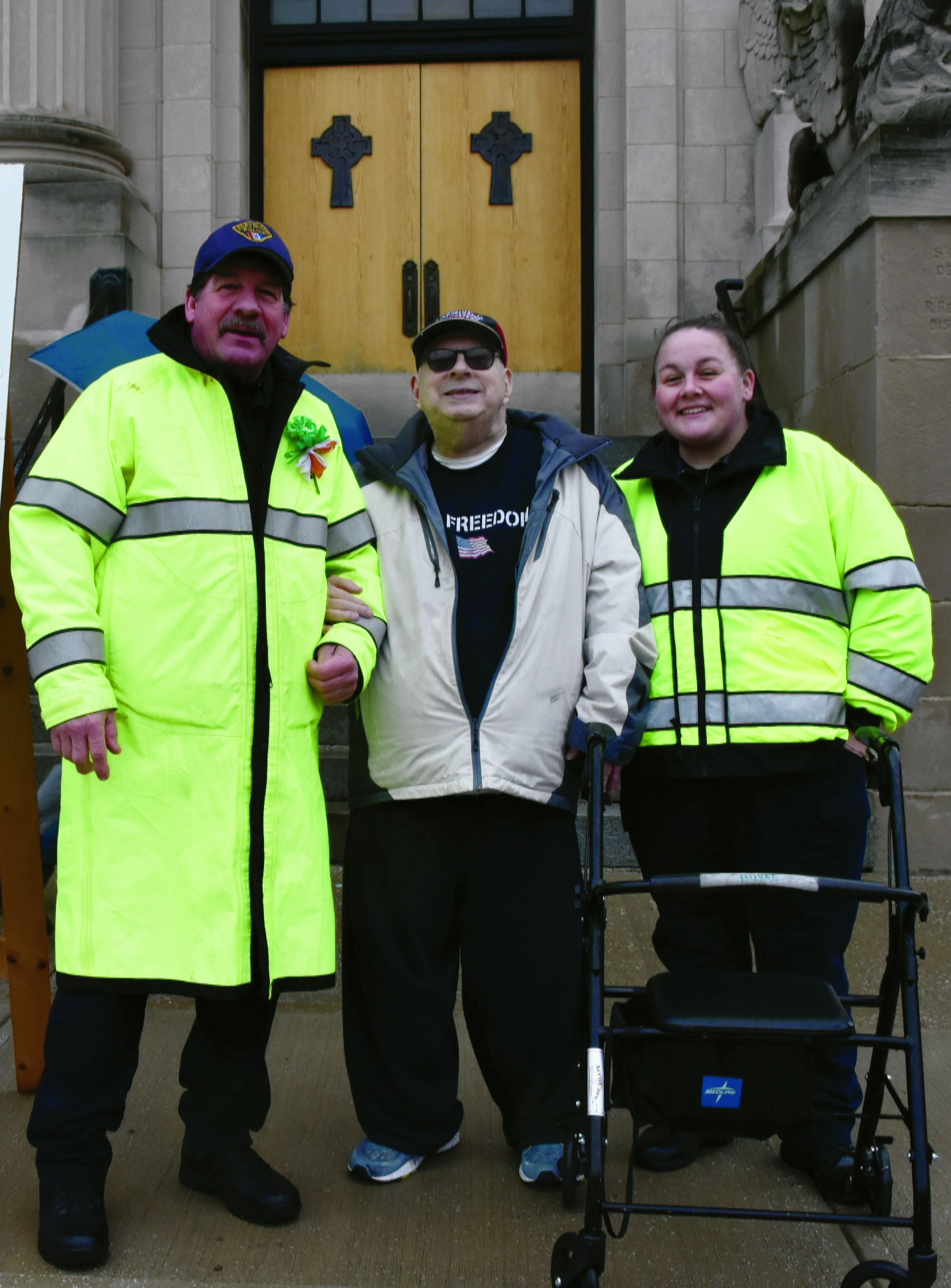 Friday, March 17, 2023; St. Colman Church, 2027 W. 65th Street: (L-R) Dave Lewis, Edward Burke, and Nicki Lewis. Father and daughter team Dave and Nicki Lewis, both City of Cleveland Public Utilities Security officers, helped direct traffic, provide security, and assist pedestrians crossing the street to attend mass at St. Colman prior to the Saint Patrick’s Day parade. Ed Burke was one of the pedestrians who benefited from their assistance in crossing the street. Dave Lewis said he has been helping at events at St. Colman Church for at least ten years.