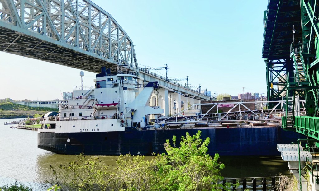Tuesday, May 9, 2023; Cuyahoga River at the Columbus Road Bridge: The freighter Sam Laud out of Wilmington, Delaware passes under the Columbus Road lift bridge on its way back out to Lake Erie. Cyclists and cars waited and watched as the large freighter traversed under the lifted Columbus Road Bridge. The next bridge ahead of the freighter is the Cuyahoga Viaduct over which the Greater Cleveland Regional Transit Authority Red Line trains travel.