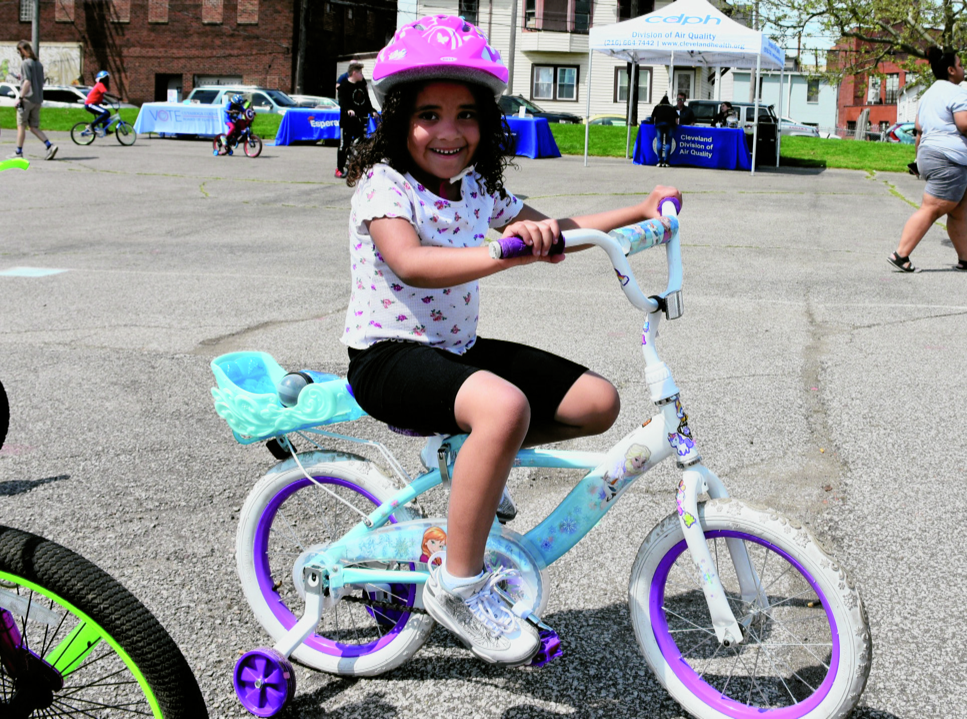 Saturday May 6, 2023; Stockyard Neighborhood Bike-a-thon, Clark Elementary School, 5550 Clark Avenue: Bethzaida Esquilin, age 5, rides her bike while wearing her new helmet. Children under age 10 received a free bike helmet when they preregistered for the event.