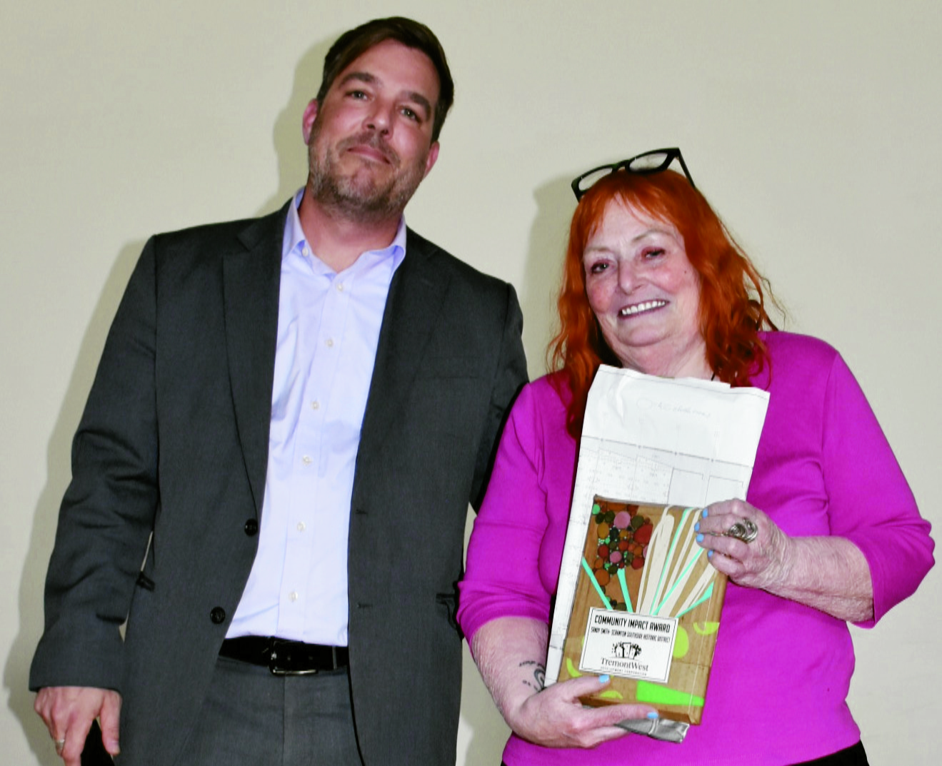 Henry Senyak was awarded the Gail Long Lifetime Achievement Award for his many years of service and exceptional contributions to the community. In presenting the award, Riordan said that the award, named after longtime Merrick House staff member Gail Long, isn’t presented every year. He then noted Senyak’s service that included serving as President of TWDC, serving on the TWDC Economic Development Committee and his longtime service as chair of the Lincoln Heights Block Club. Accomplishments by Senyak included the leading efforts in the development of a community plan for the Lincoln Heights neighborhood called Reaching Lincoln Heights. The plan, which other block clubs are beginning to emulate, includes voluntary contributions by developers to a fund that sets aside money to help residents make repairs to their homes– helping them to afford to remain in the neighborhood. Riordan said that while he has had disagreements with Senyak over the years, “he’s our guy, and he works on behalf of the people he cares about.”