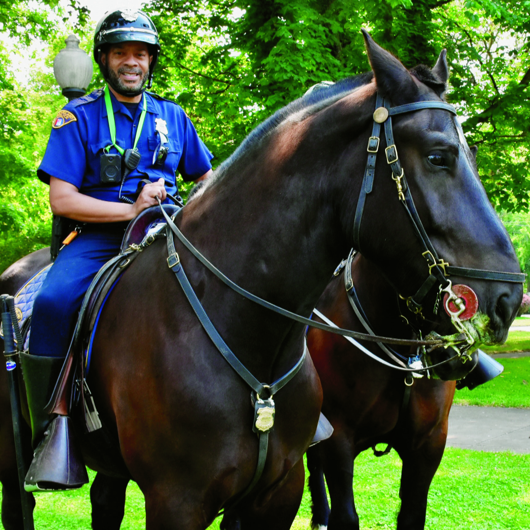Thursday, June 8, 2023, Word on the Street Block Party, Carnegie West Branch of the Cleveland Public Library, 1900 Fulton Road: Officer Big George, Cleveland Mounted Police Department’s newest horse, with his handler Officer Derek Davis, inspecting the activities and keeping the children and families safe at Word on the Street the Block party at the Carnegie West Branch of the Cleveland Public Library.