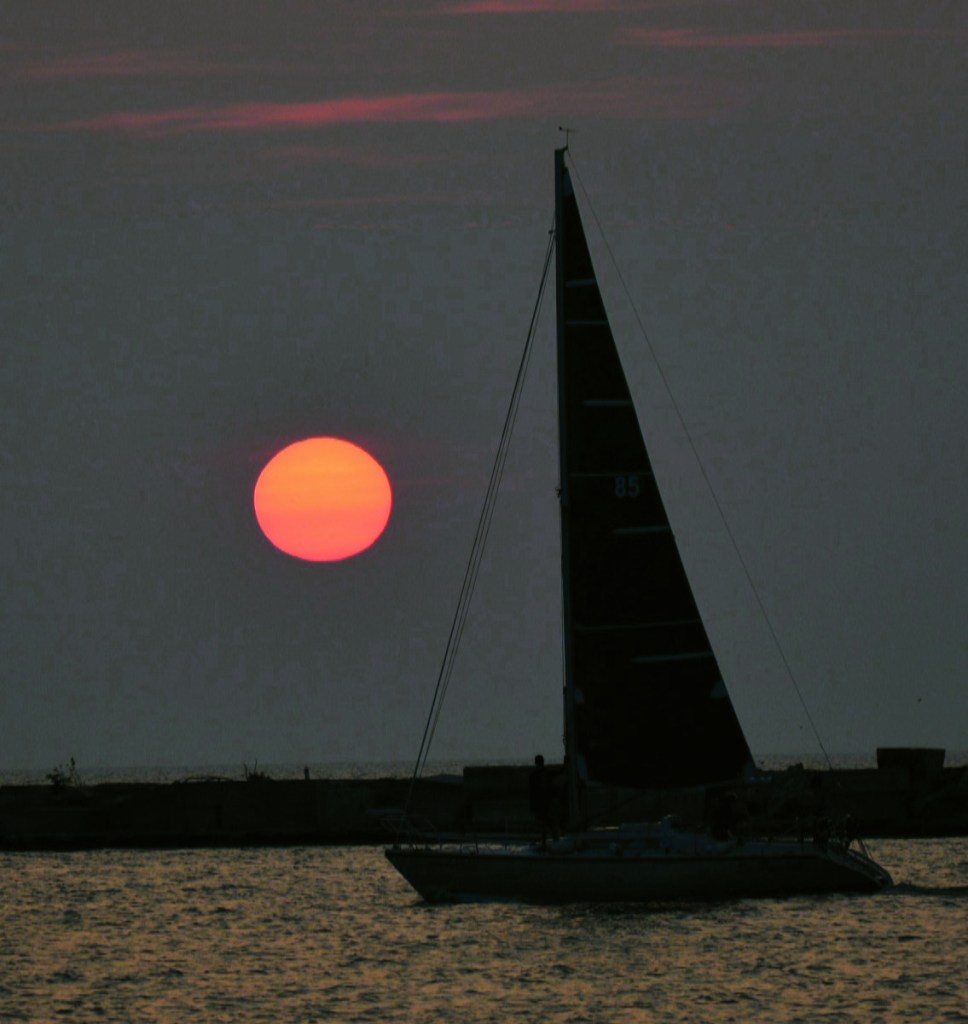 Wednesday, June 21, 2023; Summer solstice, Wendy Park, 2800 Whisky Island Dr; The solstice sun setting on Lake Erie as onlookers of a passing sailboat gaze on. The summer solstice is the day with the most sunlight. From this point forward, there will be incrementally less sunlight until the winter solstice in December.