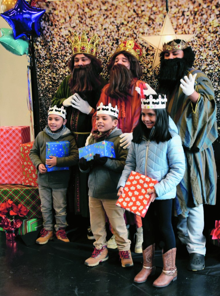 Sunday, January 7, 2024; Three Kings Day celebration, Pivot Center for Art, Dance and Expression, 2937 W. 25th Street: Angel, Alejandro and Isabela Salmeron hold their gifts as they pose for a photo with the Three Kings – (L-R) Luis Madera, Elizander Rivera, and Reynaldo Melendez.