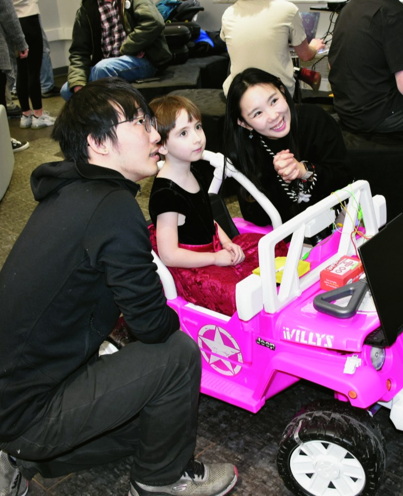 Two graduate students, Tina Xu and Haoen Lu, attended the grand opening of Studio 525 to demonstrate how Choo Choo Zoo works. With the help of Xu and Lu, five-year-old Marta Kilmer of Lyndhurst, Ohio tried out the video game. She sat in a toy jeep equipped with a large arrow, a steering wheel, and other means to interact with zoo animals in the video game which appear on a small screen in the front of the jeep as well as on a large screen on the wall.