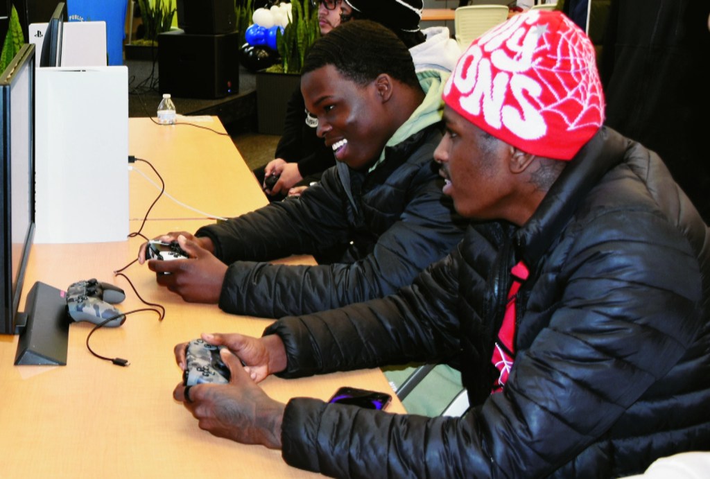 Saturday, February 17, 2024; Louis Stokes wing of the Cleveland Public Library’s Main Library, 525 Superior Avenue, 1st Floor: Grand opening of Studio 525, the Cleveland Public Library’s cutting-edge tech space for teens. Teens enjoy a video game in which pair of teens compete on a virtual basketball court.
