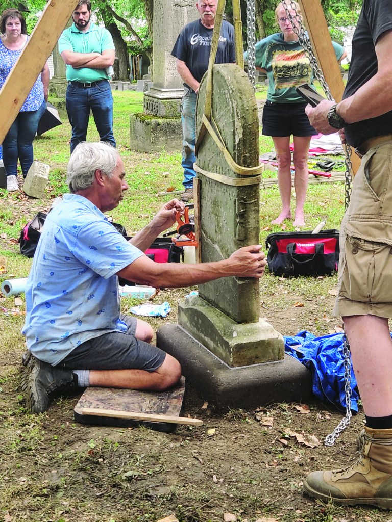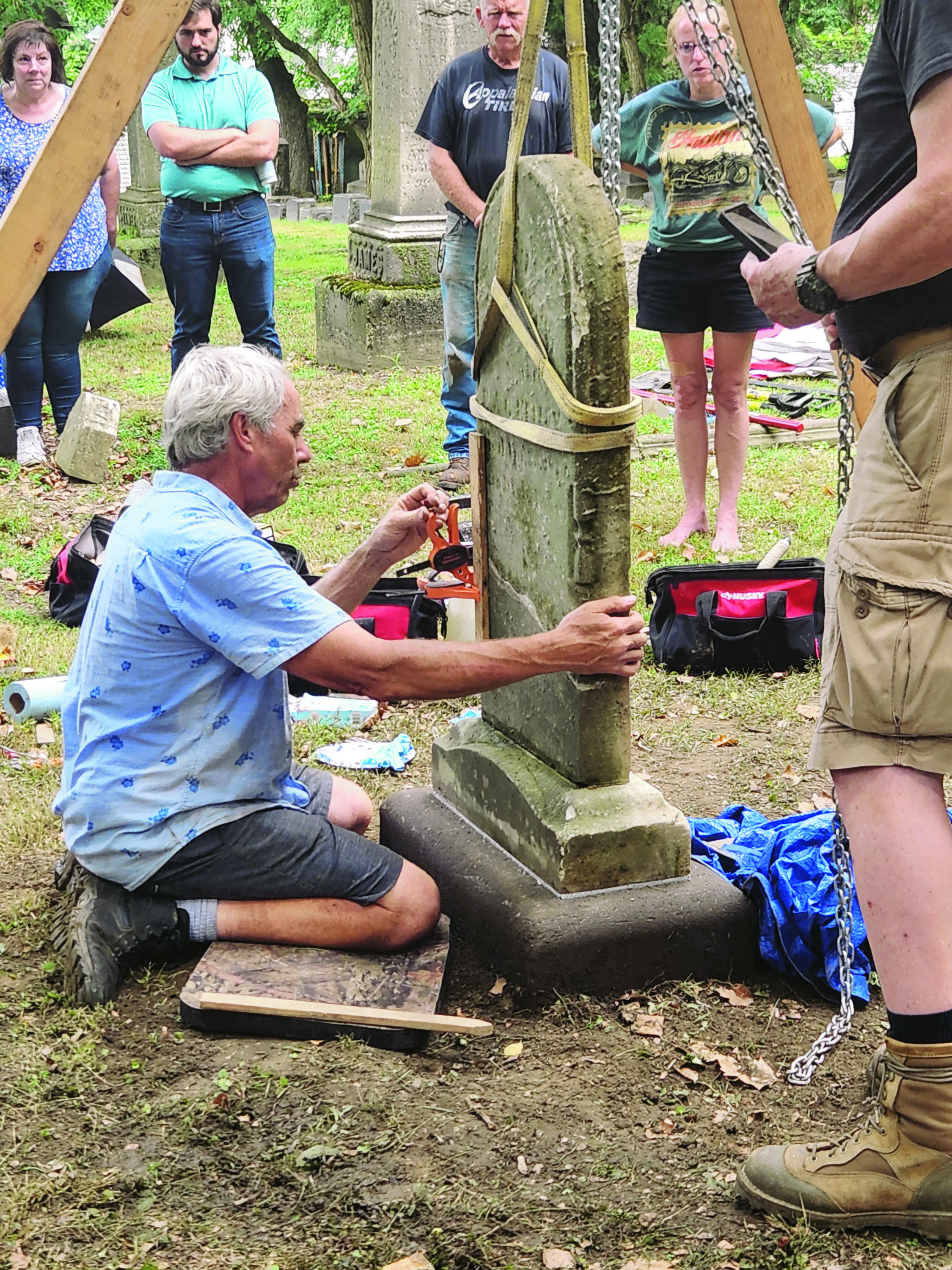 Monday, August 5, 2024; Brookmere Cemetery, 3645 Broadview Rd., in the Old Brooklyn neighborhood of Cleveland: Cleveland residents as well as residents of other cities in Ohio and neighboring states attended an outdoor workshop demonstrating how to clean, repair and reposition headstones. The workshop was conducted by Jonathan Appell, founder of “48StateTour! — Saving America’s Graveyards”.