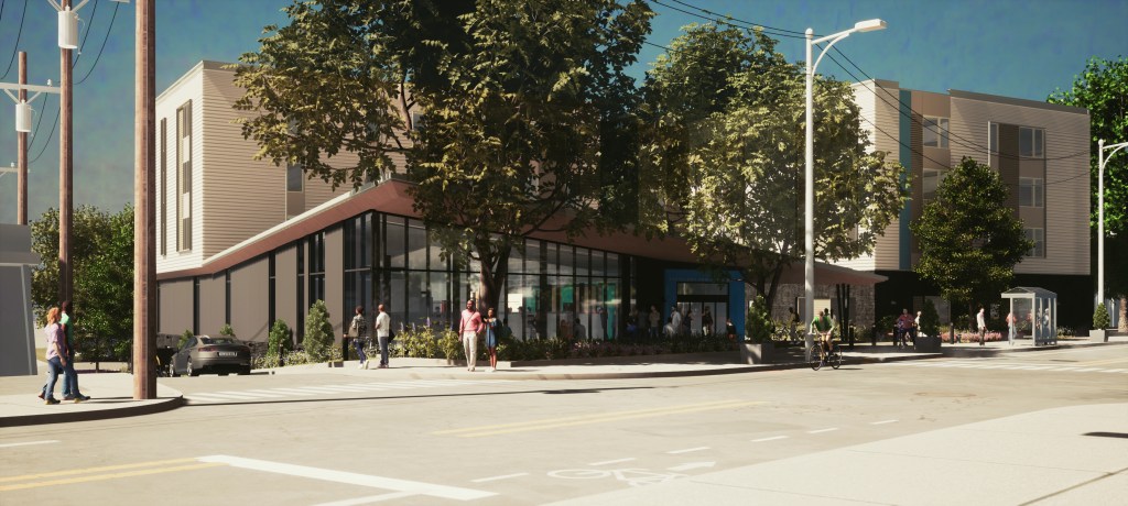 This architectural rendering shows a front view of the future Walz Campus of the Cleveland Public Library at W. 80th and Detroit Avenue which includes an addition called Karam Senior Living. Karam Senior Living will provide affordable housing to area senior citizens.