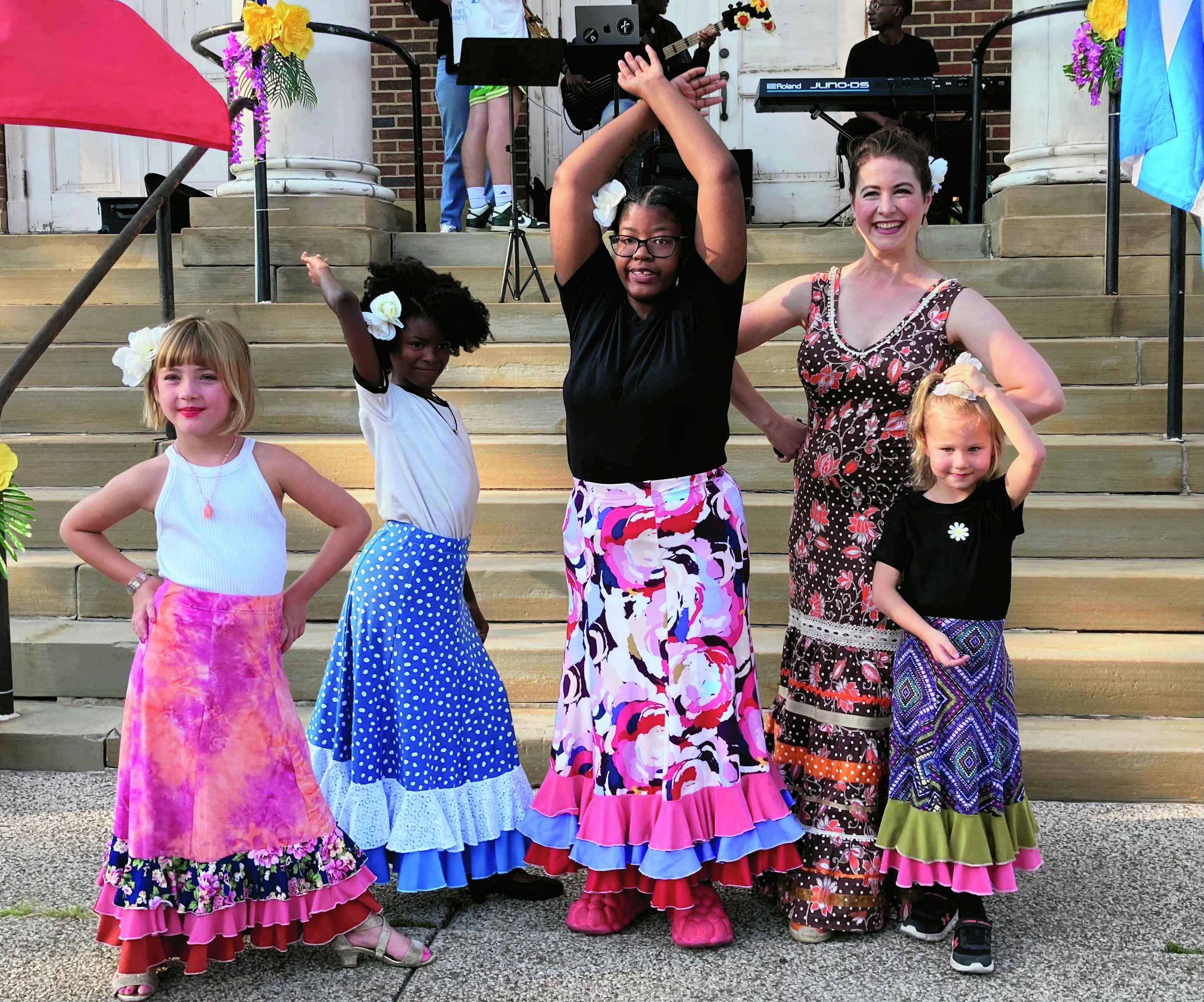 Saturday, September 14, 2024; Julia de Burgos Cultural Dance Center’s Hispanic-Latino Heritage Month Celebration, 2800 Archwood Avenue: Alice Blumenfeld, of ABREPASO Flamenco, stands with a group of young aspiring Flamenco dancers. Blumenfeld teaches kids and adult Flamenco classes at Julia de Burgos Cultural Arts Center.