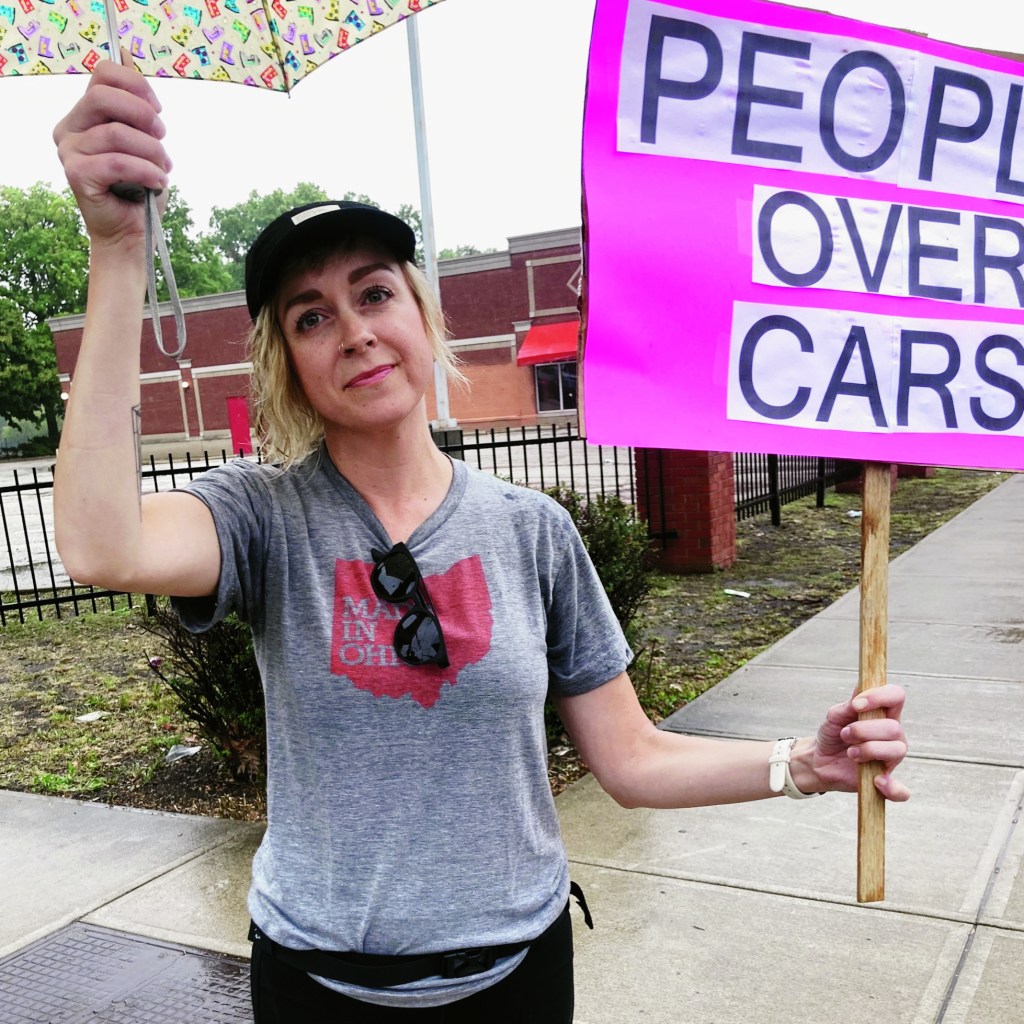 Friday, September 6,2024; Residents protest proposed gas station at former CVS site at 10022 Madison Avenue: Christine Ferges’ sign says, “People over cars”.