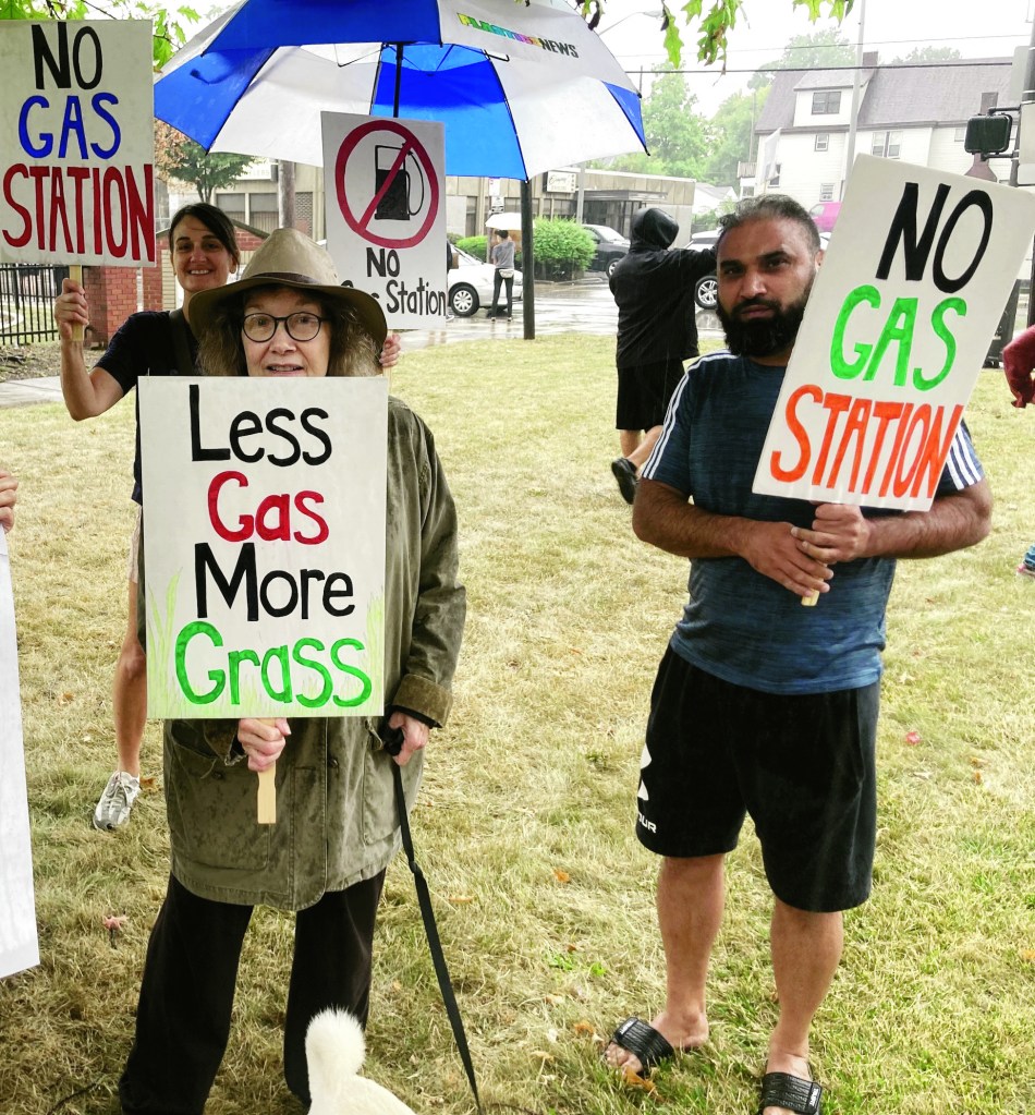 (Plain Press October 2024) Protesters stood in the rain at the corner of West Boulevard and Madison Ave to express their opposition and support for a plan to replace the former CVS building with a gas station. The proposed project is adjacent to Cudell Commons Park, Cudell Recreation Center, and Marion-Seltzer Elementary School. Many neighborhood residents opposed the plan, while several protestors supported it.