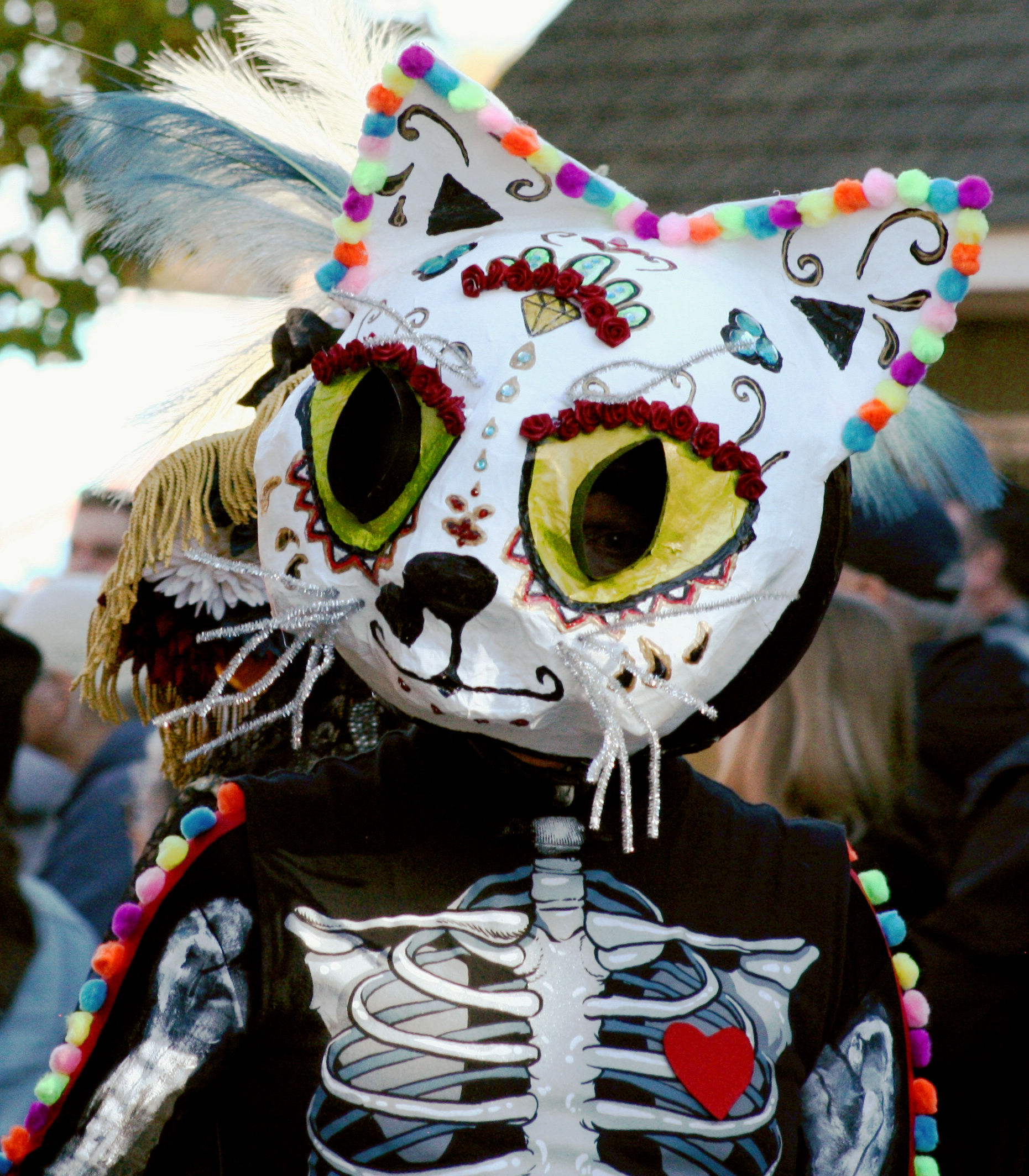 Saturday, November 2, 2024; Day of the Dead Festival, Cleveland Public Theatre: A participant dressed in a colorful cat mask marches in the annual Day of the Dead parade.
