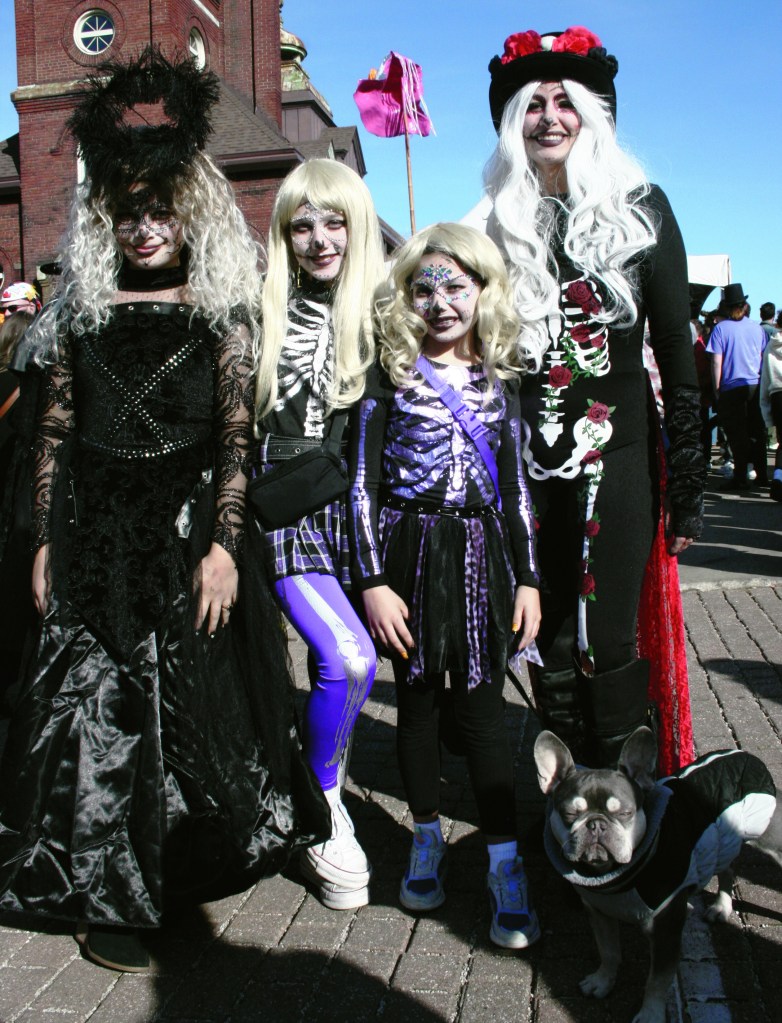 Saturday, November 2, 2024; Day of the Dead Festival, Cleveland Public Theatre: Festival attendees Gina, Ellie, Francesca, and Franny (with their dog Bruno) show off their festive costumes.
