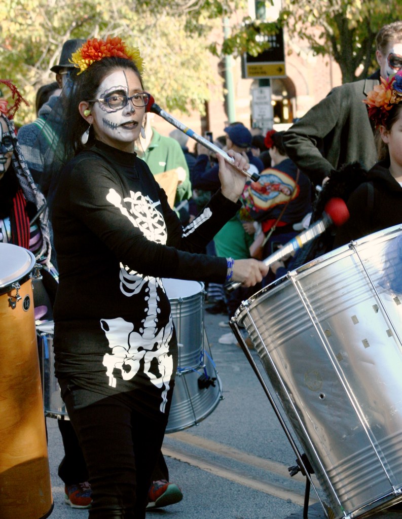 Saturday, November 2, 2024; Day of the Dead Festival, Cleveland Public Theatre: A participant in the annual Day of the Dead Parade bangs on a large drum.