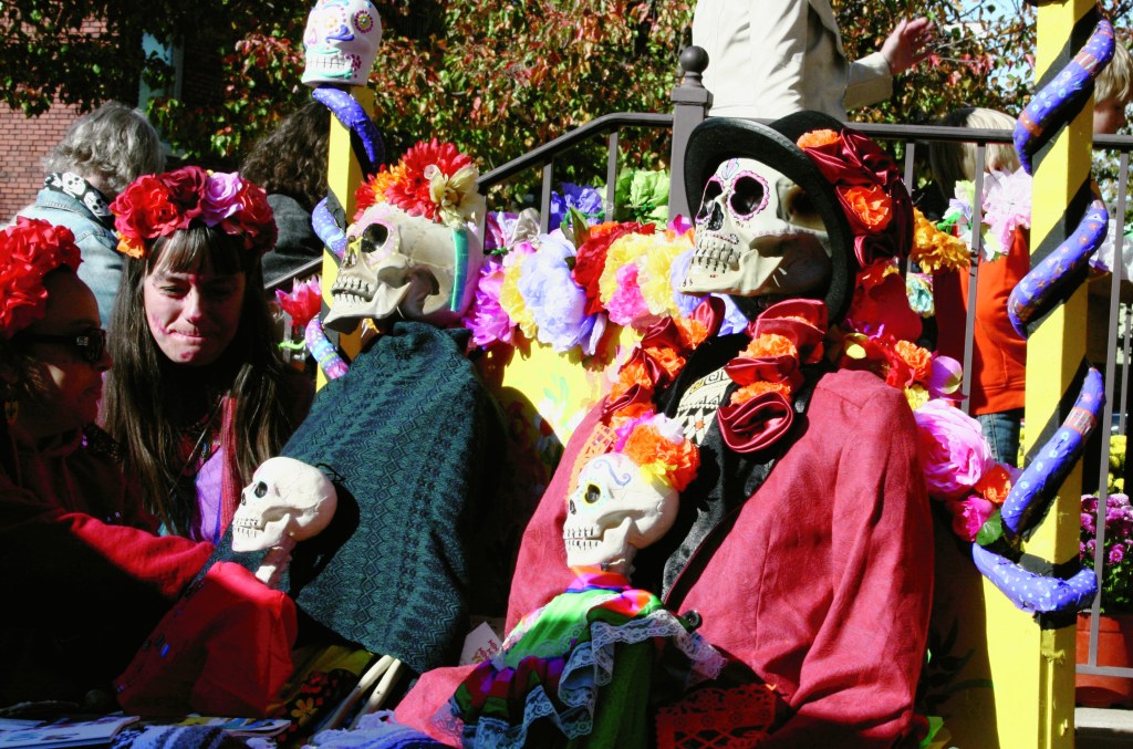 Saturday, November 2, 2024; Day of the Dead Festival, Cleveland Public Theatre: A festival attendee stands next to a float featuring a pair of skeletons. Tradition holds that on the Day of the Dead, the line between the living and the dead blurs, allowing dead people to visit with their still-living relatives.