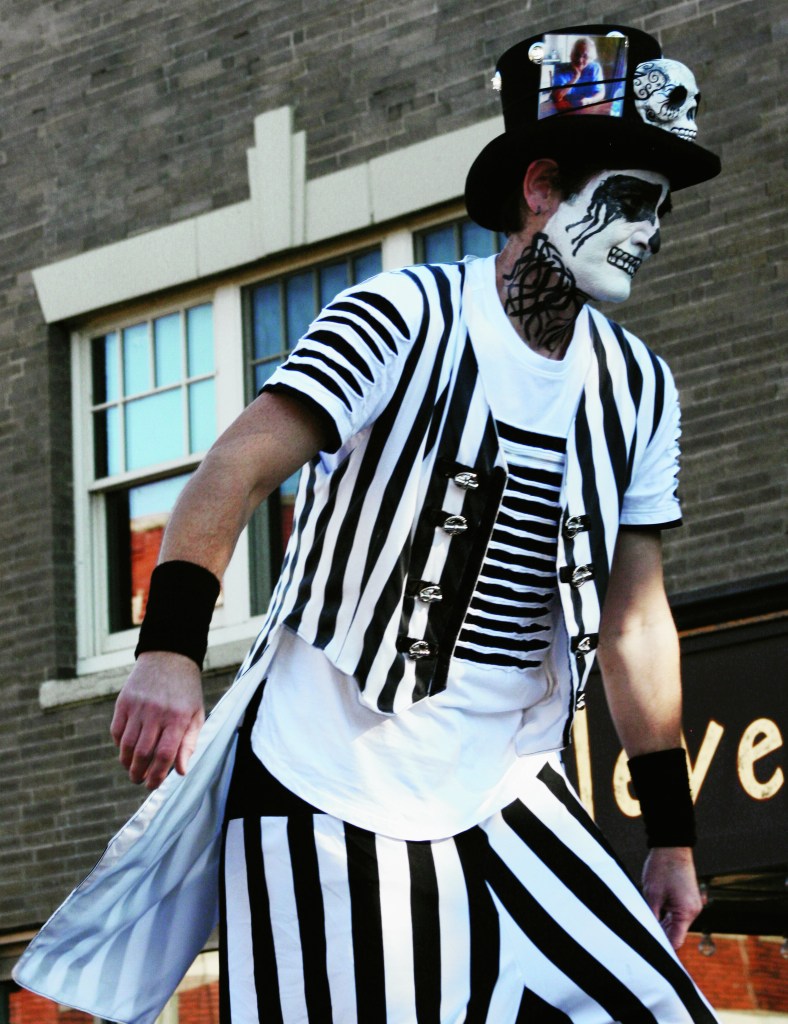 Saturday, November 2, 2024; Day of the Dead Festival, Cleveland Public Theatre: A stilt walker in a striped costume walks in the Skulls and Skeleton parade outside of the Cleveland Public Theatre on Detroit Ave. in the Gordon Square Arts District.