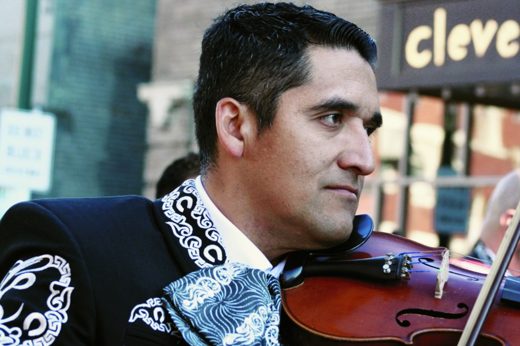 Saturday, November 2, 2024; Day of the Dead Festival, Cleveland Public Theatre: A performer in a mariachi band entertains the crowd with his violin.
