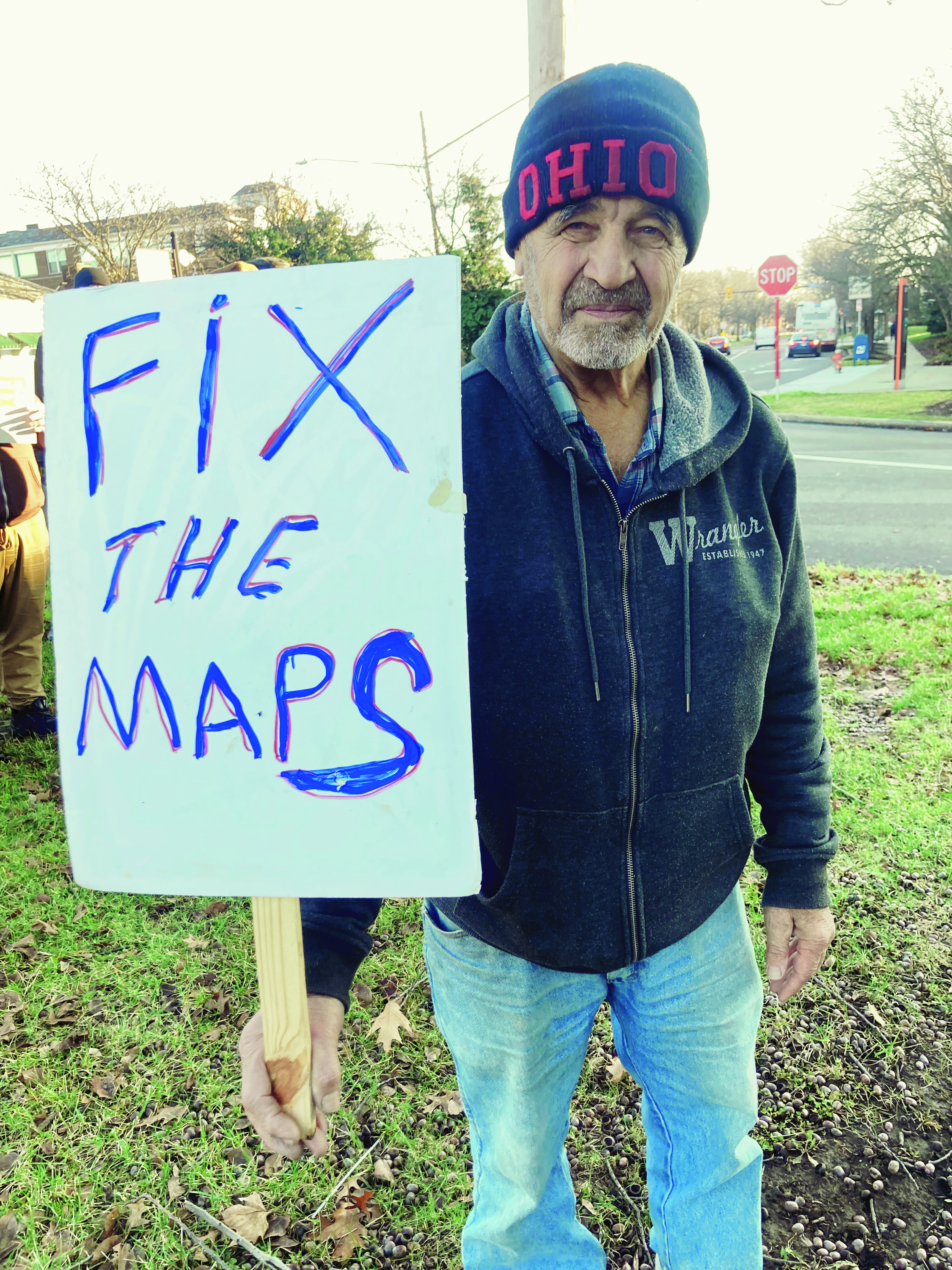 (Plain Press February 2025) Faouzi Badeour, a resident of the Cudell neighborhood, was standing in Shaker Square in the below-freezing temperature holding a protest sign that read “Fix the Maps”. It was just a few minutes past 5:00 p.m., and commuter traffic was heavy. Some drivers honked their horns to support the Cleveland protesters. Others drove by, seemingly uninterested.