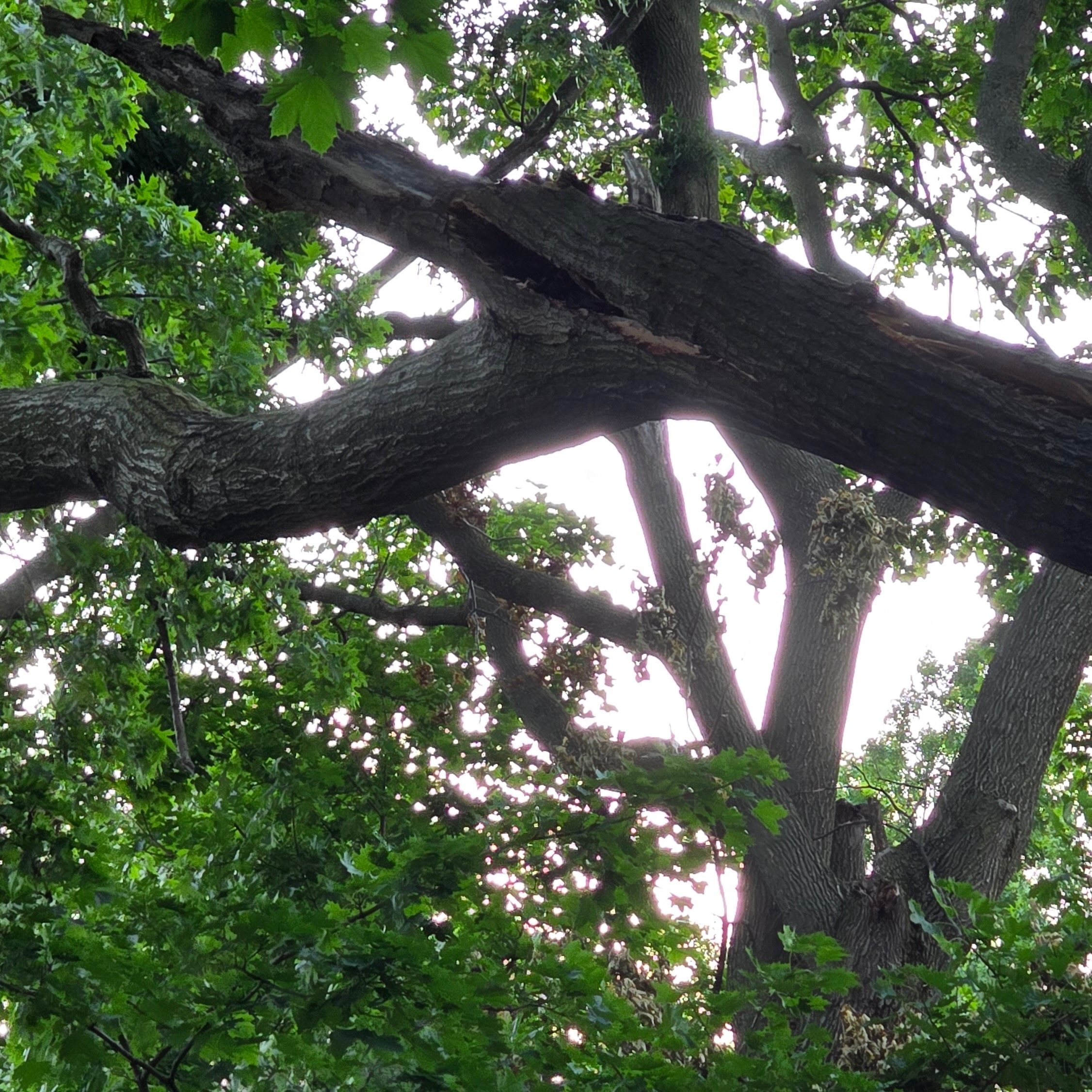 Saturday, July 5, 2025; Ben Franklin Community Garden: A branch in this maple tree cracked while those organizing a concert in the garden were setting up chairs under the tree. The seating area was moved to avoid a potential disaster.