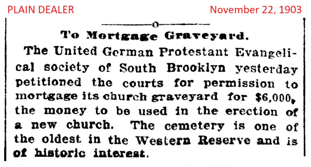 This little gem of a newspaper clipping comes from the November 22nd, 1903, edition of The Plain Dealer, accessible at the Cleveland Public Library’s Plain Dealer Historical database. It clearly establishes that in 1903 a cemetery was still associated with the Evangelical Church (most recently known as St. Luke’s United Church of Christ) at the corner of Pearl Road and Memphis Avenue. The last sentence supports everyone who believes that the cemetery is important and wants it to be spared from the planned new construction. To the left is an image from the Cleveland Leader with additional information about mortgaging the cemetery.