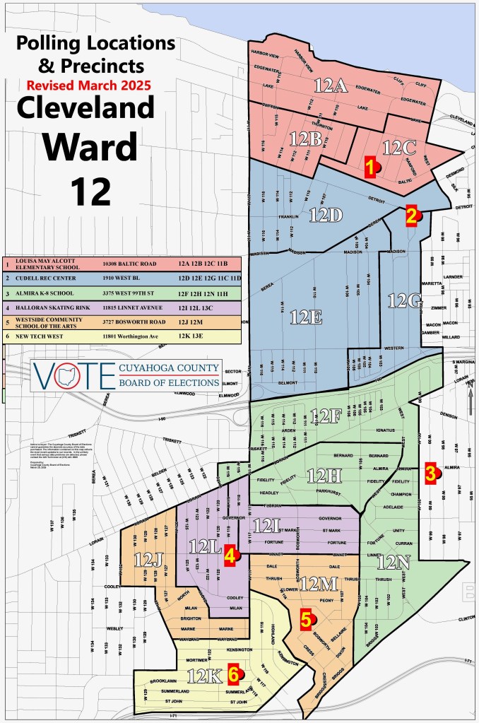 The candidates will be on the ballot in the September 9th Primary Election. The top two finishers in the Primary Election will again be on the ballot in the November General Election. To check if you live in the new Ward 12, see the accompanying Ward 12 Map downloaded from the Cuyahoga County Board of Election’s website or visit the website at: boe.cuyahogacounty.gov and click on Maps and Data.