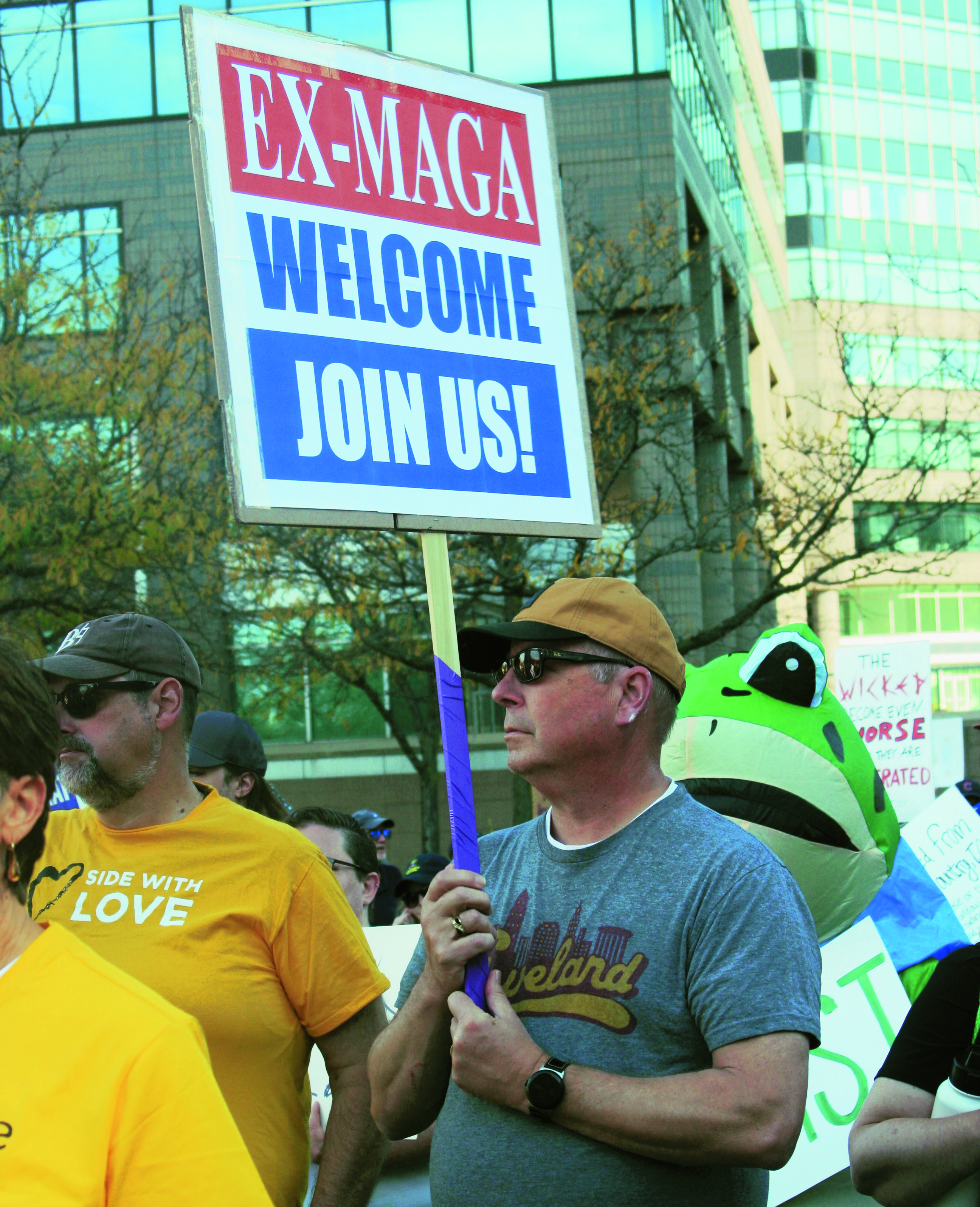(Plain Press November 2025) Thousands of Greater Cleveland residents gathered for a No Kings Rally in Willard Park by the Free Stamp on Lakeside Avenue in downtown Cleveland on October 18th to exercise their First Amendment “right of the people to peaceably assemble and to petition the government for a redress of grievances.”