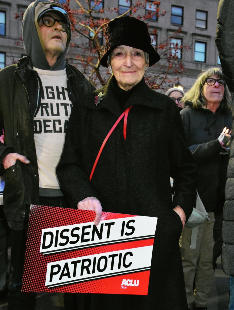 Friday, January 9, 2026; Candlelight vigil in memory of Renee Good, Market Square Park, W. 25th and Lorain Avenue: This woman expresses her patriotism through protest.
