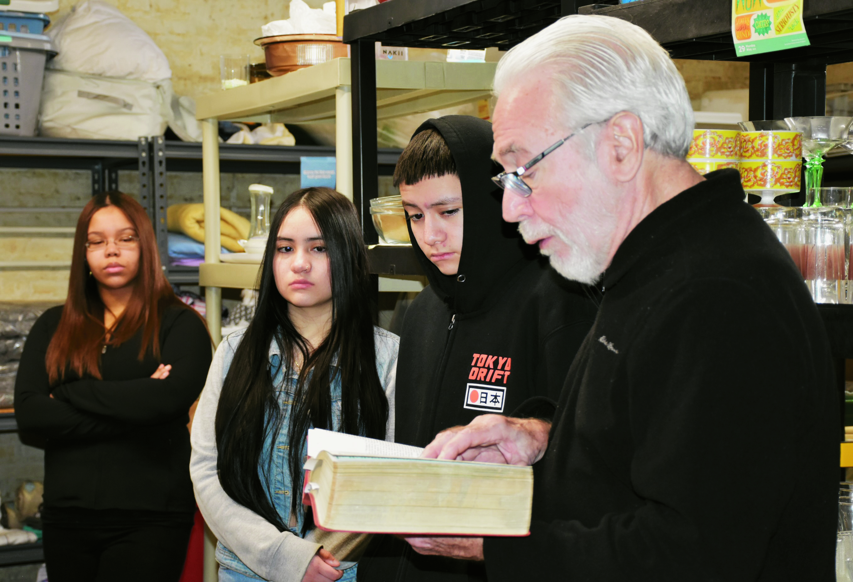 February 2026; Refugee Resource Center, Saint Colman Church Hall: While giving a tour of the Refugee Resource Center and Saint Colman Church to a youth group from La Sagrada Familia Parish, Father Rob Reidy reads a bible passage from the Letter of James on the importance that faith be joined by works. Fr. Reidy said, “This is what social justice is all about.”
