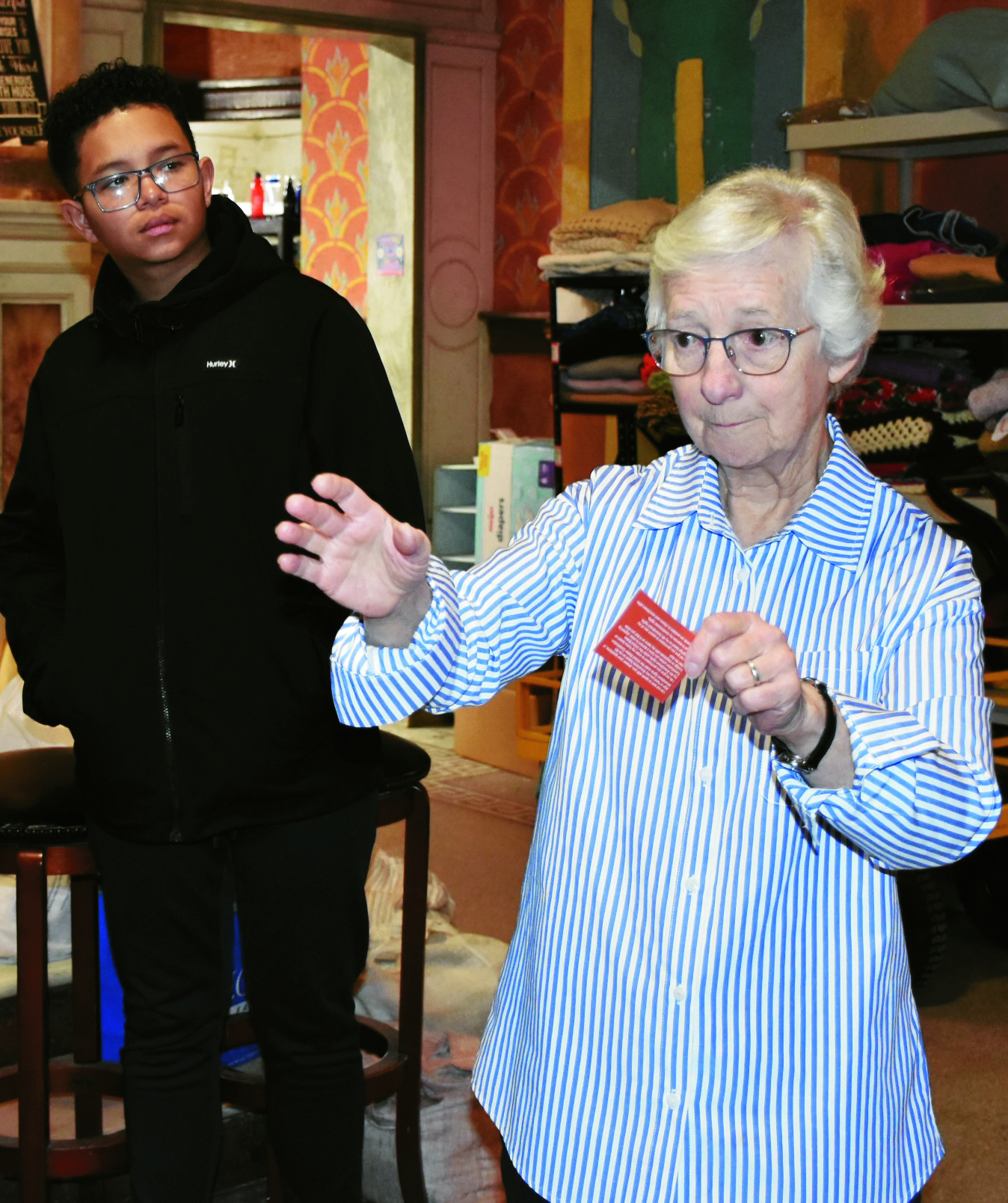 February 2026; Refugee Resource Center, Saint Colman Church Hall: Sister Rita Mary Harwood, SND (Sisters of Notre Dame), talks to guests about the Refugee Resource Center and how it operates.